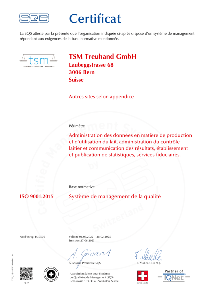 TSM met en oeuvre les exigences de la norme ISO 9001:2015. Au cœur de la gestion de la qualité se trouvent la satisfaction de la clientèle et le processus d’amélioration constante dans tous les domaines. Pour TSM, cela consiste d’une part à contrôler régulièrement sa politique de qualité et, d’autre part, à évaluer les objectifs de qualité, les feed-backs des clients et les propositions internes d’amélioration. En outre, TSM réalise des audits internes et est évaluée chaque année lors d’un audit externe effectué par SQS. Le système de gestion de la qualité est aussi utilisé par TSM comme outil de gestion des connaissances.